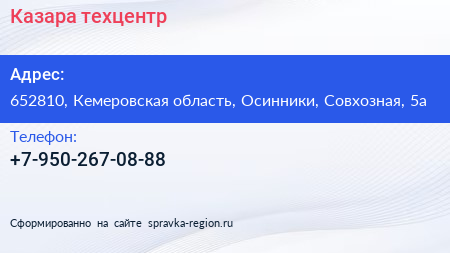 Казара, техцентр по адресу 652810, Кемеровская область, Осинники, Совхозная, 5а в дальнейшем Организация, размещена в следующих категориях:
