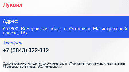 Лукойл по адресу 652800, Кемеровская область, Осинники, Магистральный проезд, 18а в дальнейшем Организация, размещена в следующих категориях: