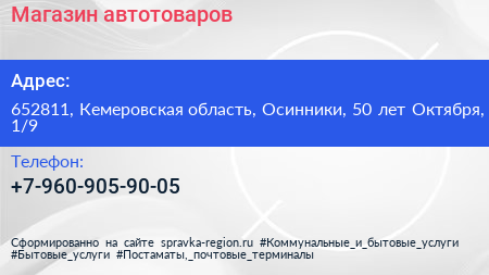 Магазин автотоваров по адресу 652811, Кемеровская область, Осинники, 50 лет Октября, 1/9 в дальнейшем Организация, размещена в следующих категориях: