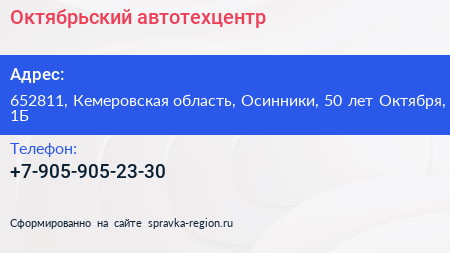 Октябрьский, автотехцентр по адресу 652811, Кемеровская область, Осинники, 50 лет Октября, 1Б в дальнейшем Организация, размещена в следующих категориях:
