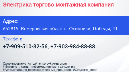 Электрика, торгово-монтажная компания по адресу 652815, Кемеровская область, Осинники, Победы, 41 в дальнейшем Организация, размещена в следующих категориях:
