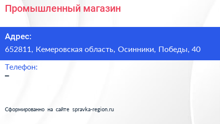 Промышленный магазин по адресу 652811, Кемеровская область, Осинники, Победы, 40 в дальнейшем Организация, размещена в следующих категориях: