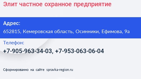 Элит, частное охранное предприятие по адресу 652815, Кемеровская область, Осинники, Ефимова, 9а в дальнейшем Организация, размещена в следующих категориях: