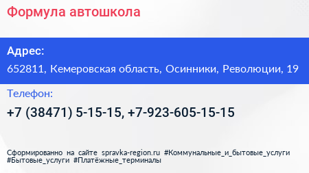 Формула, автошкола по адресу 652811, Кемеровская область, Осинники, Революции, 19 в дальнейшем Организация, размещена в следующих категориях: