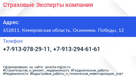 Страховые Эксперты, компания по адресу 652811, Кемеровская область, Осинники, Победы, 12 в дальнейшем Организация, размещена в следующих категориях: