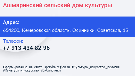 Ашмаринский сельский дом культуры по адресу 654200, Кемеровская область, Осинники, Советская, 15 в дальнейшем Организация, размещена в следующих категориях: