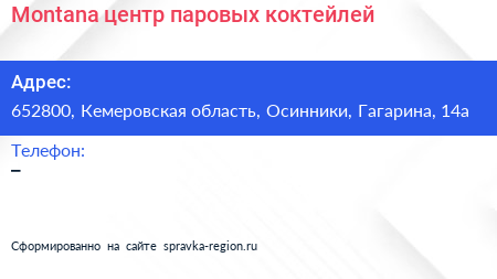 Montana, центр паровых коктейлей по адресу 652800, Кемеровская область, Осинники, Гагарина, 14а в дальнейшем Организация, размещена в следующих категориях: