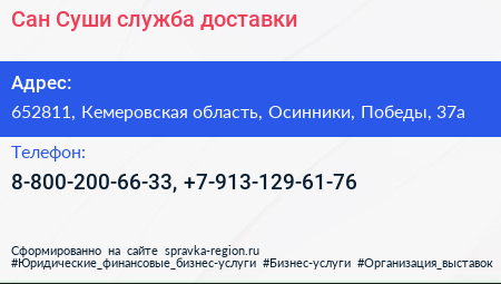 Сан Суши, служба доставки по адресу 652811, Кемеровская область, Осинники, Победы, 37а в дальнейшем Организация, размещена в следующих категориях: