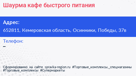Шаурма, кафе быстрого питания по адресу 652811, Кемеровская область, Осинники, Победы, 37в в дальнейшем Организация, размещена в следующих категориях: