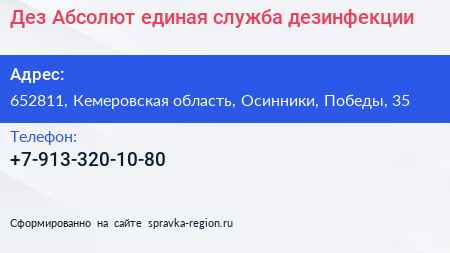 Дез-Абсолют, единая служба дезинфекции по адресу 652811, Кемеровская область, Осинники, Победы, 35 в дальнейшем Организация, размещена в следующих категориях: