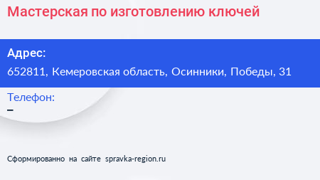 Мастерская по изготовлению ключей по адресу 652811, Кемеровская область, Осинники, Победы, 31 в дальнейшем Организация, размещена в следующих категориях: