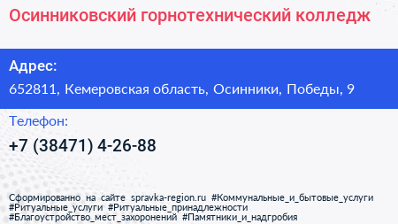 Осинниковский горнотехнический колледж по адресу 652811, Кемеровская область, Осинники, Победы, 9 в дальнейшем Организация, размещена в следующих категориях: