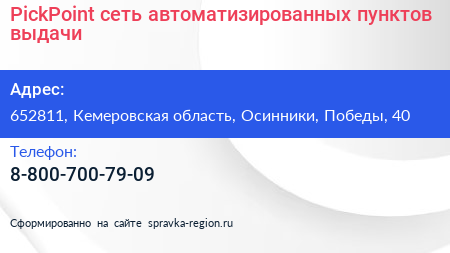 PickPoint, сеть автоматизированных пунктов выдачи по адресу 652811, Кемеровская область, Осинники, Победы, 40 в дальнейшем Организация, размещена в следующих категориях: