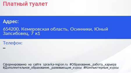 Платный туалет по адресу 654200, Кемеровская область, Осинники, Юный Запсибовец, 7 к1 в дальнейшем Организация, размещена в следующих категориях: