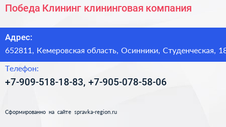 Победа-Клининг, клининговая компания по адресу 652811, Кемеровская область, Осинники, Студенческая, 18 в дальнейшем Организация, размещена в следующих категориях:
