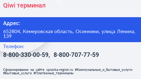 Qiwi, терминал по адресу 652804, Кемеровская область, Осинники, улица Ленина, 139 в дальнейшем Организация, размещена в следующих категориях: