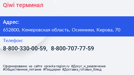 Qiwi, терминал по адресу 652800, Кемеровская область, Осинники, Кирова, 70 в дальнейшем Организация, размещена в следующих категориях: