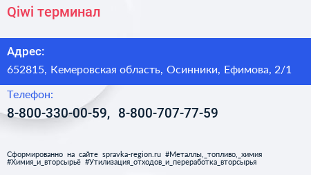 Qiwi, терминал по адресу 652815, Кемеровская область, Осинники, Ефимова, 2/1 в дальнейшем Организация, размещена в следующих категориях: