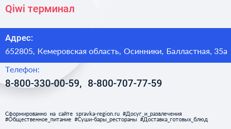Qiwi, терминал по адресу 652805, Кемеровская область, Осинники, Балластная, 35а в дальнейшем Организация, размещена в следующих категориях: