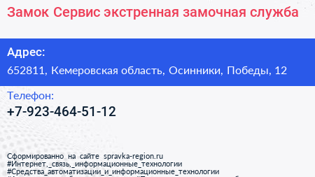 Замок-Сервис, экстренная замочная служба по адресу 652811, Кемеровская область, Осинники, Победы, 12 в дальнейшем Организация, размещена в следующих категориях: