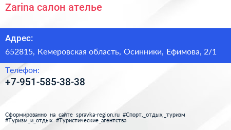 Zarina, салон-ателье по адресу 652815, Кемеровская область, Осинники, Ефимова, 2/1 в дальнейшем Организация, размещена в следующих категориях: