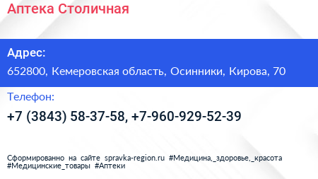 Аптека Столичная по адресу 652800, Кемеровская область, Осинники, Кирова, 70 в дальнейшем Организация, размещена в следующих категориях: