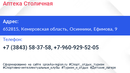Аптека Столичная по адресу 652815, Кемеровская область, Осинники, Ефимова, 9 в дальнейшем Организация, размещена в следующих категориях: