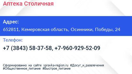 Аптека Столичная по адресу 652811, Кемеровская область, Осинники, Победы, 24 в дальнейшем Организация, размещена в следующих категориях:
