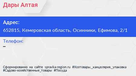 Дары Алтая по адресу 652815, Кемеровская область, Осинники, Ефимова, 2/1 в дальнейшем Организация, размещена в следующих категориях: