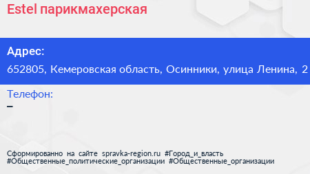 Estel, парикмахерская по адресу 652805, Кемеровская область, Осинники, улица Ленина, 2 в дальнейшем Организация, размещена в следующих категориях: