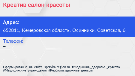 Креатив, салон красоты по адресу 652811, Кемеровская область, Осинники, Советская, 6 в дальнейшем Организация, размещена в следующих категориях: