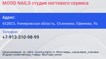 MOOD NAILS, студия ногтевого сервиса по адресу 652815, Кемеровская область, Осинники, Ефимова, 9а в дальнейшем Организация, размещена в следующих категориях: