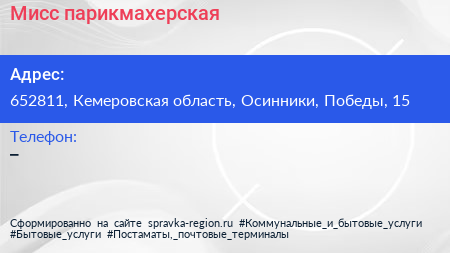Мисс, парикмахерская по адресу 652811, Кемеровская область, Осинники, Победы, 15 в дальнейшем Организация, размещена в следующих категориях: