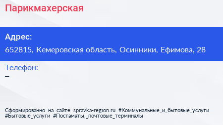Парикмахерская по адресу 652815, Кемеровская область, Осинники, Ефимова, 28 в дальнейшем Организация, размещена в следующих категориях: