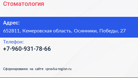 Стоматология по адресу 652811, Кемеровская область, Осинники, Победы, 27 в дальнейшем Организация, размещена в следующих категориях: