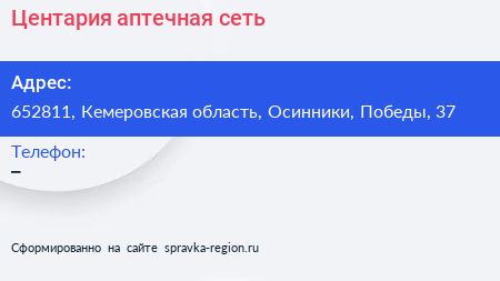 Центария, аптечная сеть по адресу 652811, Кемеровская область, Осинники, Победы, 37 в дальнейшем Организация, размещена в следующих категориях: