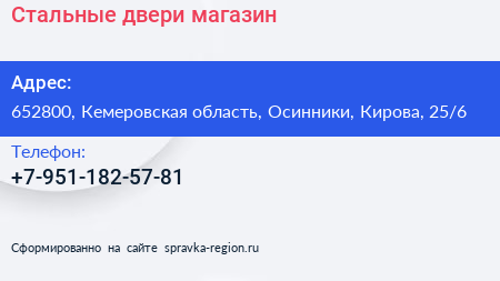 Стальные двери, магазин по адресу 652800, Кемеровская область, Осинники, Кирова, 25/6 в дальнейшем Организация, размещена в следующих категориях: