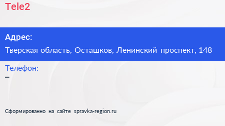 Tele2 по адресу Тверская область, Осташков, Ленинский проспект, 148 в дальнейшем Организация, размещена в следующих категориях: