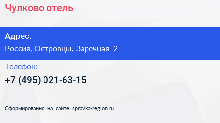 Чулково, отель по адресу 2, Заречная улица, Коттеджный посёлок «Чулково-Club», Каменное Тяжино, Раменский городской округ, Московская область, Центральный федеральный округ, 140125, Россия в дальнейшем Организация, размещена в следующих категориях: