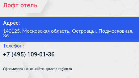 Лофт-отель по адресу 140125, Московская область, Островцы, Подмосковная, 36 в дальнейшем Организация, размещена в следующих категориях: