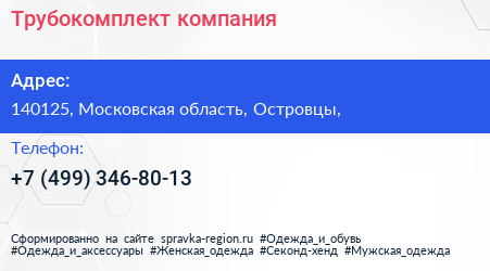 Трубокомплект, компания по адресу 140125, Московская область, Островцы, в дальнейшем Организация, размещена в следующих категориях: