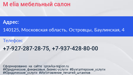M-elia, мебельный салон по адресу 140125, Московская область, Островцы, Баулинская, 4 в дальнейшем Организация, размещена в следующих категориях: