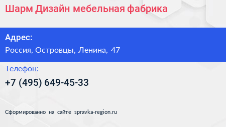 Шарм Дизайн, мебельная фабрика по адресу Торговый комплекс "Текстиль-Профи", 47, улица Ленина, Михнево, Октябрьский, городской округ Люберцы, Московская область, Центральный федеральный округ, 140060, Россия в дальнейшем Организация, размещена в следующих категориях: