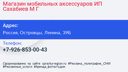 Магазин мобильных аксессуаров, ИП Сахабиев М.Г. по адресу Торговый комплекс "Октябрёнок", 39Б, улица Ленина, Михнево, Октябрьский, городской округ Люберцы, Московская область, Центральный федеральный округ, 140060, Россия в дальнейшем Организация, размещена в следующих категориях: