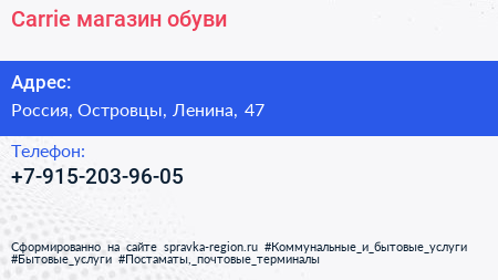 Carrie, магазин обуви по адресу Торговый комплекс "Текстиль-Профи", 47, улица Ленина, Михнево, Октябрьский, городской округ Люберцы, Московская область, Центральный федеральный округ, 140060, Россия в дальнейшем Организация, размещена в следующих категориях: