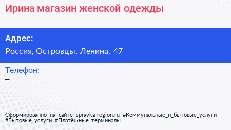 Ирина, магазин женской одежды по адресу Торговый комплекс "Текстиль-Профи", 47, улица Ленина, Михнево, Октябрьский, городской округ Люберцы, Московская область, Центральный федеральный округ, 140060, Россия в дальнейшем Организация, размещена в следующих категориях: