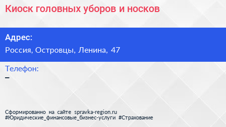 Киоск головных уборов и носков по адресу Торговый комплекс "Текстиль-Профи", 47, улица Ленина, Михнево, Октябрьский, городской округ Люберцы, Московская область, Центральный федеральный округ, 140060, Россия в дальнейшем Организация, размещена в следующих категориях:
