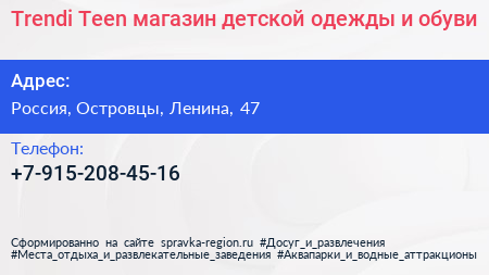 Trendi Teen, магазин детской одежды и обуви по адресу Торговый комплекс "Текстиль-Профи", 47, улица Ленина, Михнево, Октябрьский, городской округ Люберцы, Московская область, Центральный федеральный округ, 140060, Россия в дальнейшем Организация, размещена в следующих категориях: