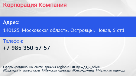 Корпорация, Компания по адресу 140125, Московская область, Островцы, Новая, 6 ст1 в дальнейшем Организация, размещена в следующих категориях: