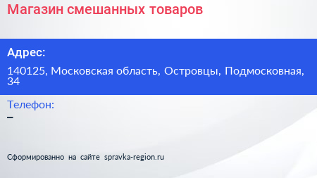 Магазин смешанных товаров по адресу 140125, Московская область, Островцы, Подмосковная, 34 в дальнейшем Организация, размещена в следующих категориях: